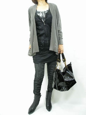 黒ベースの辛口コーディはしなやかなロングカーディでエレガントをプラス!スタイリッシュ度90%、エレガンス度10%。
