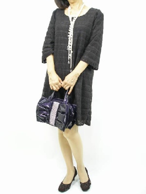 総レースの上品なワンピース。濃いブラウンがエレガントさをアップしてくれますね。パープルのバッグでアクセントをつけてみました!エレガンス度90%、スタイリッシュ度10%。