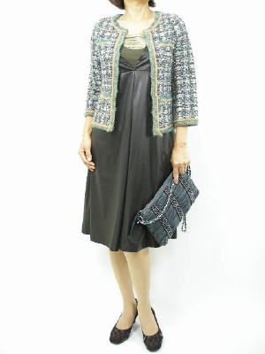 ツイード風ニットジャケットにフェイクスエードのワンピ・・・。素材MIXがオシャレのポイント!エレガンス度70%、フェミニン度30%。