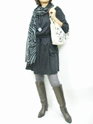 レイヤードしたようなワンピースにストールをあえてダーク系にするとクールさがアップします!スタイリッシュ度80%、エレガンス度20%。