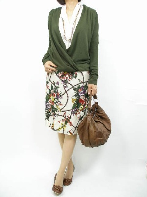 トレンドのカシュクールカーデは、お花プリントのスカートで軽やかに!フェミニン度100%。