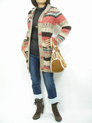 冬らしいマルチボーダーのニット。ボア付きデニムやムートンバッグでとことん冬らしさを楽しんで!アクティブ度90%、フェミニン度10%