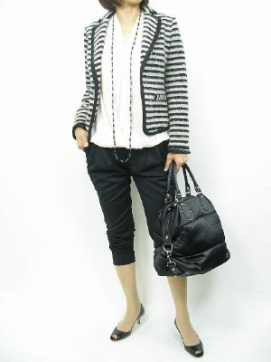 サルエルパンツはツイードジャケットで女らしく決めたい。一連のアクセをポイントにしてみました!スタイリッシュ度100%。