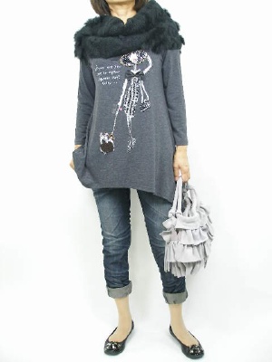 カットソーの図柄がとてもチャーミング。流行りのスヌードを合わせればこれからの季節もOKですね!フェミニン度70%、アクティブ度30%。