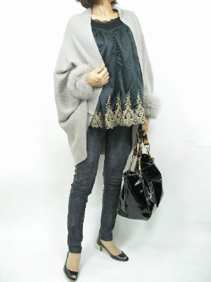 ボリュームのあるブラウスとモモンガカーディのコーディネート。お袖のファーがポイントですね!スタイリッシュ度80%、フェミニン度20%。