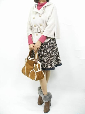 ポンチョ型のコートはスカートと可愛く合わせたい。インナーのピンク色を差し色にして!フェミニン度80%、エレガンス度20%。