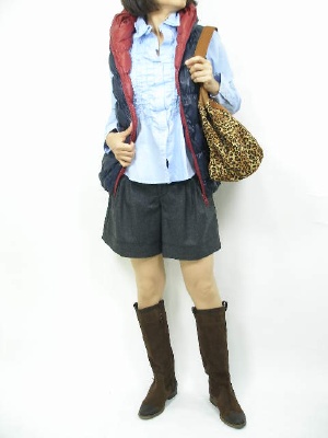 スポーティなダウンベストをあえてキレイ目にコーディネート。足元をブーツにすればバランスもOK!アクティブ度70%、フェミニン度30%。