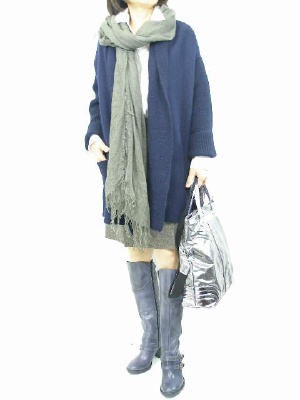 たっぷりカーディを白シャツで引き締めて。ストールで縦のラインを出せば今年風!スタイリッシュ度100%。