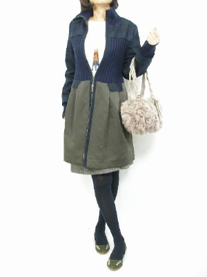 凝ったデザインのワンピースコートは前を開いて着てもステキです。インナーのスカイツリーをアクセントに!フェミニン度80%、スタイリッシュ度20%。