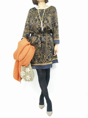 光沢のあるワンピースは、夜のお出かけにも映えます。帰りはキレイ色のカーディを羽織って!エレガンス度90%、フェミニン度10%