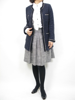 紺×白で清楚なスタイルは胸元のフリルで可愛さをだして。目上の方との会食には好印象間違いなしです!フェミニン度80%、エレガンス度20%。