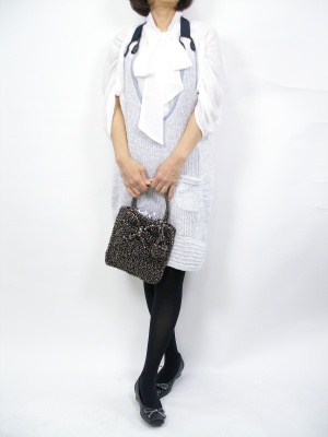 リボンタイのフェミニンなブラウスとチュニックワンピースとの重ね着は、柔らかな春の装いいにピッタリですね!フェミニン度90%、スタイリッシュ度10%。