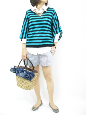 変形ニットに合わせるのはやっぱり白シャツ。軽快なショートパンツで春モードにチェンジ!アクティブ度90%、フェミニン度10%。