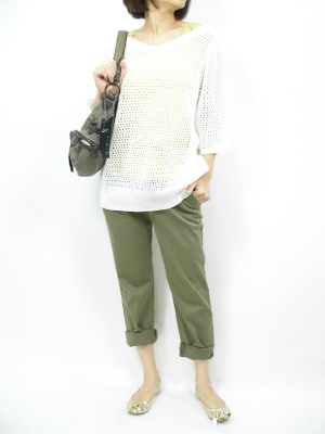 ざっくりニットとタンクトップ。デイリーファッションには欠かせません。ゆるシルエットのカーキパンツで普段のお洒落も楽しんで!アクティブ度70%、フェミニン度30%。