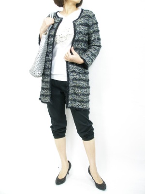 サルエルパンツはカッコ良くはきたい。ロングカーディもカッチリした形を選ぶとスタイリッシュな装いになります!スタイリッシュ度80%、フェミニン度20%。