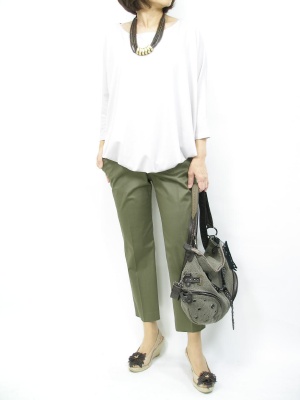 正統派なクロプトパンツには遊び心のあるバルーントップスを。ナチュラル系小物で先取り感を出して!スタイリッシュ度80%、アクティブ度20%。