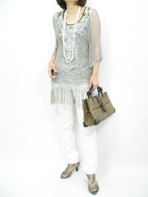 メッシュニットはアースカラーで決まり。白パンツで軽快さもプラスすれば、お出かけが楽しくなりますね!スタイリッシュ度90%、アクティブ度10%。