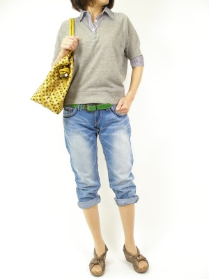 ニットとシャツが合体してなんちゃてコーディが簡単にできます。ベルトをグリーンにして遊び心を入れてみました!アクティブ度90%、スタイリッシュ度10%。