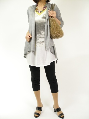 ゆるトップスのレイヤード派、ハイテンションのタイトなパンツで引き締めて!スタイリッシュ度70%、アクティブ度30%。