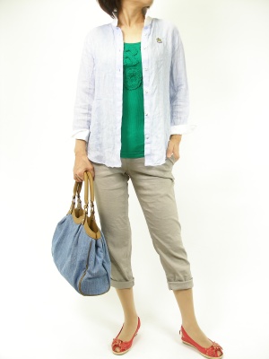 麻素材のシャツを羽織りに見立ててオフのアイテムにしてみました。真っ赤なサンダルがポイントですね!アクティブ度70%、フェミニン度30%。