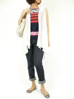 腰回りをカバーしてくれるジレは強い味方。白を選べばスッキリした印象に仕上げてくれます!アクティブ度90%、スタイリッシュ度10%。