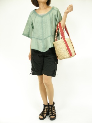 ボリュームトップスは黒のショートパンツでまとめるとコンパクトに。ブーサンで颯爽とした着こなしに!アクティブ度80%、フェミニン度20%。