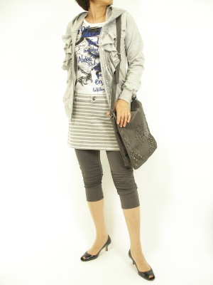 キラキラスパンコールのパーカをカットワンピースと組み合わせる。アクティブな装いをレギンスとヒールでカッコ良く着こなしたい!スタイリッシュ度60%、アクティブ度40%。