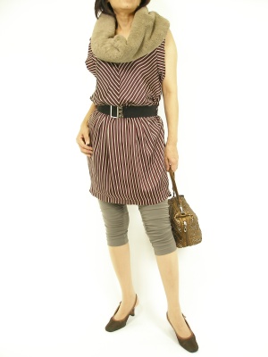直線的なラインが大人っぽいワンピには新色レギンスを合わせてちょっとモード感のある仕上がりに!エレガンス度70%、スタイリッシュ度30%。