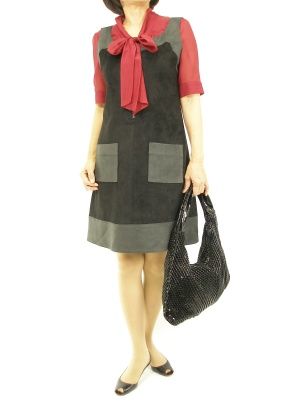 ボルドー色の綺麗なブラウスはお袖にもポイントが。カッチリしたワンピースを合わせてフェミニンエレガントな着こなしです!エレガンス度70%、フェミニン度30%。