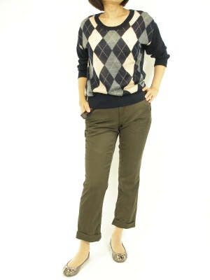 とろみのある素材のチノパンはカジュアルながらもキチンと感がのこるのが良いですね。アーガイルや異素材MIXが他とは違う大人っぽさです!アクティブ度90%、スタイリッシュ度10%。