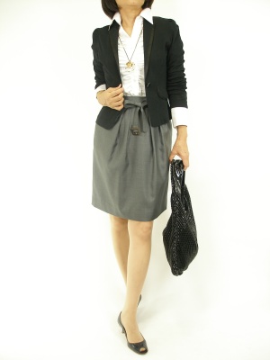 パリッとした雰囲気ですが、実は楽チンコーディ。随所にカットソーが使ってあるので体に優しいですよ!スタイリッシュ度90%、エレガンス度10%。