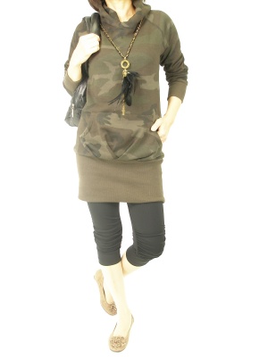 迷彩柄のチュニックワンピは、丈が短いのでレギンスを合わせて大人カジュアルに仕上げました!アクティブ度80%、スタイリッシュ度20%。