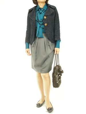 光沢のあるブラウスは、女度UPさせるキレイ目アイテム。カジュアルツイードのジャケットでかしこまり過ぎないのが今年風!スタイリッシュ度90%、アクティブ度10%。