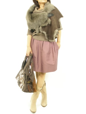 ファーをちょこっと足すと一気に華やかさを増してくれます。今年っぽい緩ニットの袖が気にならない変形ケープはお助けアイテムです!エレガンス度70%、フェミニン度30%。