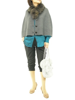 このポンチョはファー付きなのでエレガントにもカジュアルにもOKなんです。今日は光沢ブラウス投入で差し色とリッチ感をプラス。黒パンツでクールにまとめました!スタイリッシュ度80%、エレガンス度20%。