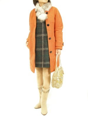 ストンとしたシルエットのワンピースにはクラシカルスタイルのコートを合わせて。ファーを加えるとワンランクUPのお出かけ着になります!エレガンス度70%、フェミニン度30%。