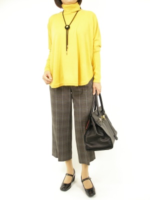鮮やかなイエローのニットとチェックのウールパンツでブリティッシュなイメージに。アクセントに懐かしいループタイを!フェミニン度60%、アクティブ度40%。