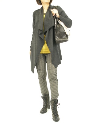 ロングカーディ+レギパンのコーディは楽な着心地なのにスリムに見えます。キレイ色のニットでメリハリをつけて!スタイリッシュ度70%、アクティブ度30%。