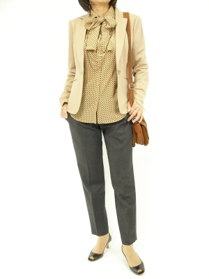 テーラードジャケットで決めた通勤スタイルもインナーをボウタイブラウスにすれば旬の顔に!スタイリッシュ度90%、エレガンス度10%。