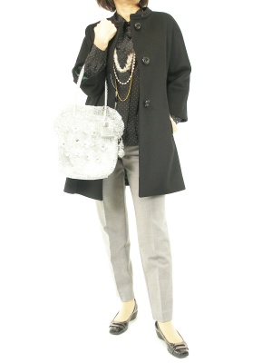 上質のウールコートは存在感が違います。あえて色は足さずにモノトーンでレトロにまとめました!エレガンス度90%、スタイリッシュ度10%。