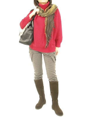 発色が綺麗な赤のニットを引き締めるのは、相性の良いこげ茶のストール。カーゴレギンスでご近所カジュアルにピッタリです!アクティブ度100%。
