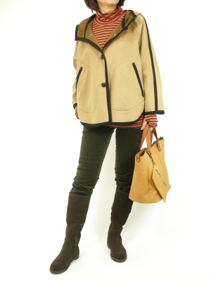 分量のあるケープはボトムスをタイトにまとめてスッキリ着こなしたい!アクティブ度90%、フェミニン度10%。