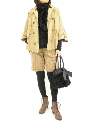 トレンチにチェックのパンツ・・。ブリティッシュなコーディネートはミニマムなデザインを選ぶとキュートな印象に!フェミニン度90%、アクティブ度10%。