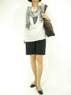 ドレープシャツはショートパンツでカッコ良く合わせたい。キラキラストールはざっくり巻くとシャツに良く合いますね!スタイリッシュ度90%、アクティブ度10%。