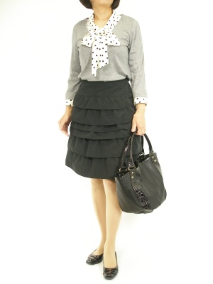 ドット柄がポイントのカットソーはふんわりティアードスカートで可憐にまとめてみました!フェミニン度80%、スタイリッシュ度20%。