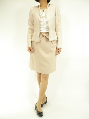 柔らかい春色のジャケットを白やベージュのナチュラルトーンでまとめて華やいだコーディネートにしてみました!エレガンス度100%。
