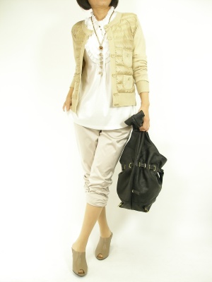 暖か春ダウンジャケットをティーパードパンツで品良く女らしくエレガントに着こなす!スタイリッシュ度70%、エレガンス度30%。
