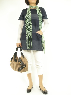 紺×白のマリンなコーディネートに甘口ストールをプラスするとさらに春らしく!フェミニン度60%、アクティブ度40%。