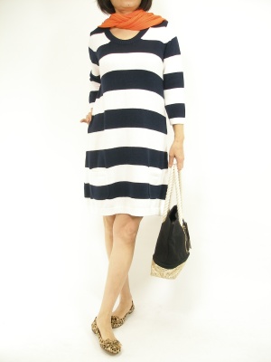 ニット地のボーダーワンピース。アニマル柄のペッタンコシューズで爽やかなカジュアルバランスをプラスする!フェミニン度80%、スタイリッシュ度20%。