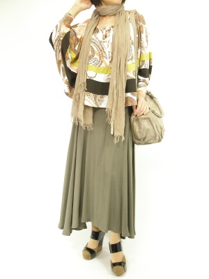 流行りのゆるゆるコーディですが、ストールとスカートの縦ラインを強調すれば大人っぽくまとまります!スタイリッシュ度60%、アクティブ度40%。